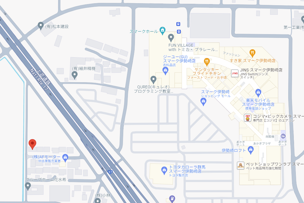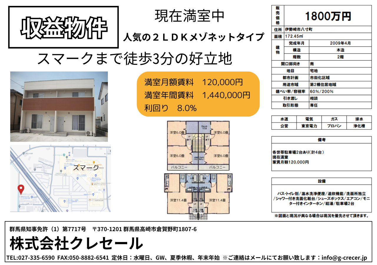 こちらの物件は大型ショッピングモール「スマーク」のすぐ横で、伊勢崎インターチェンジからも車で3-4分の好立地です。