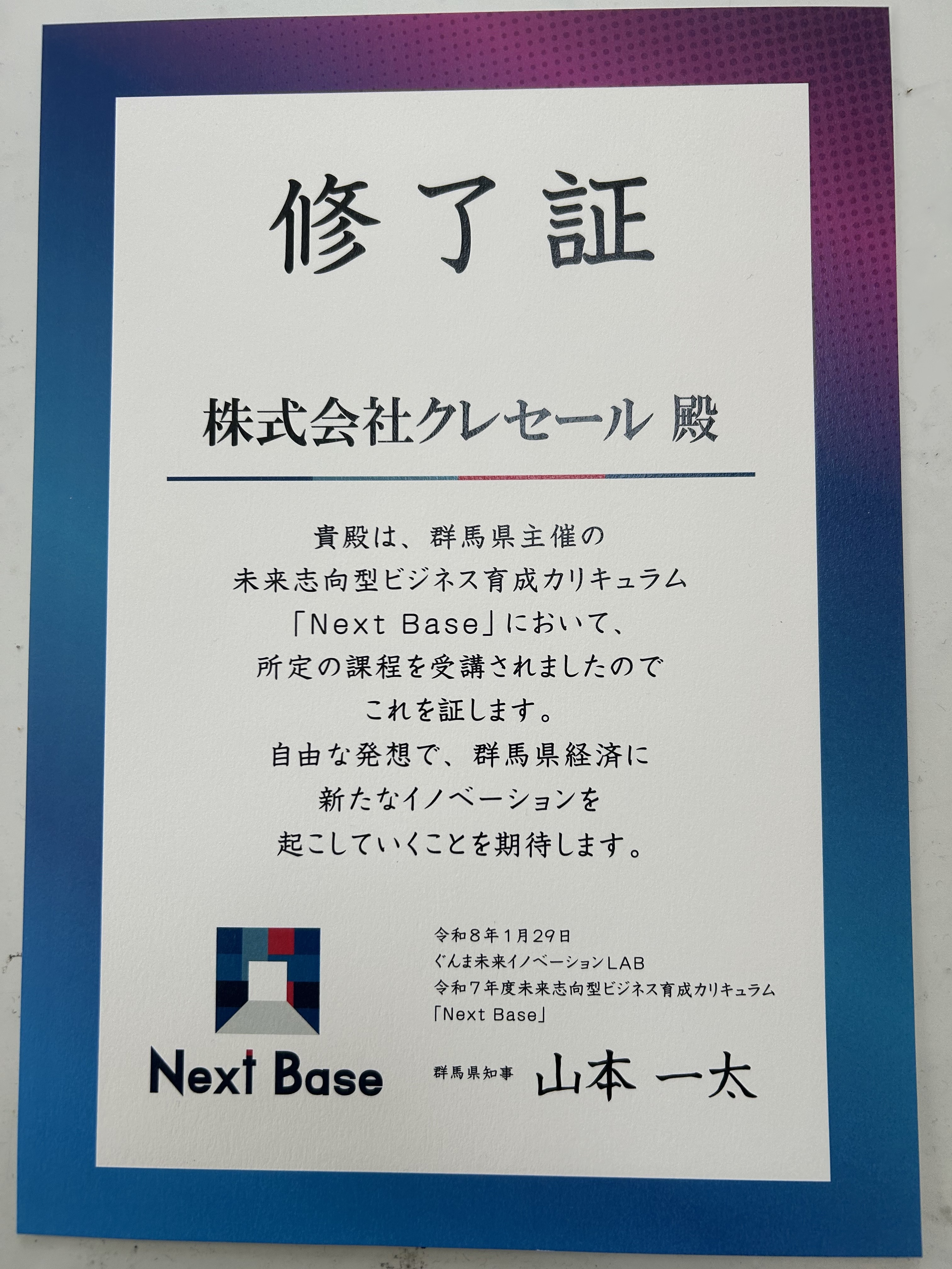 群馬県主催の未来志向型ビジネス育成カリキュラム「Next Base」において、以下のスケジュールにて計12チームが所定の過程を受講し、本日最終発表後修了証を受領しました。